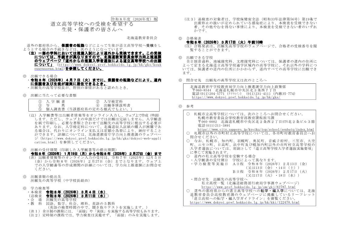 道立高等学校への受験を希望する生徒・保護者の皆さんへ