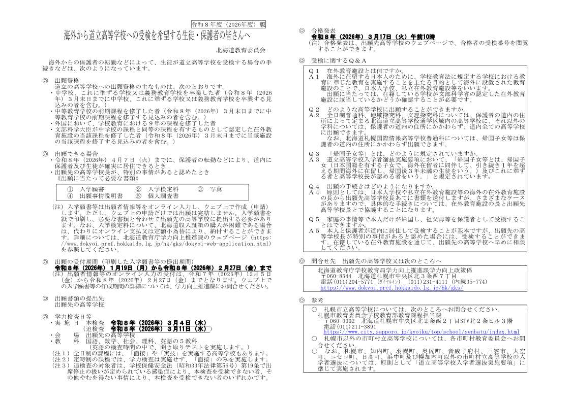 海外から道立高等学校への受験を希望する生徒・保護者の皆さんへ